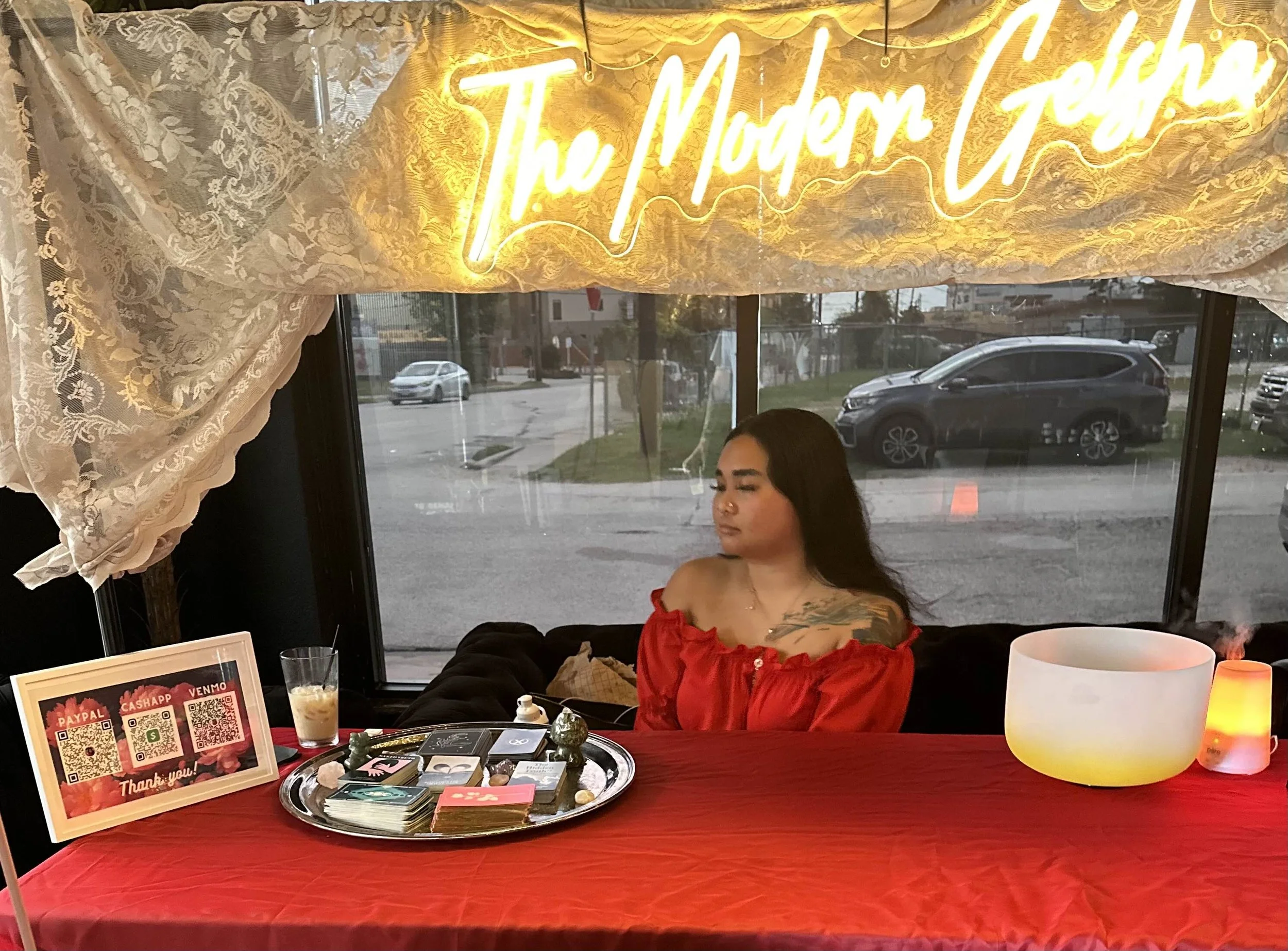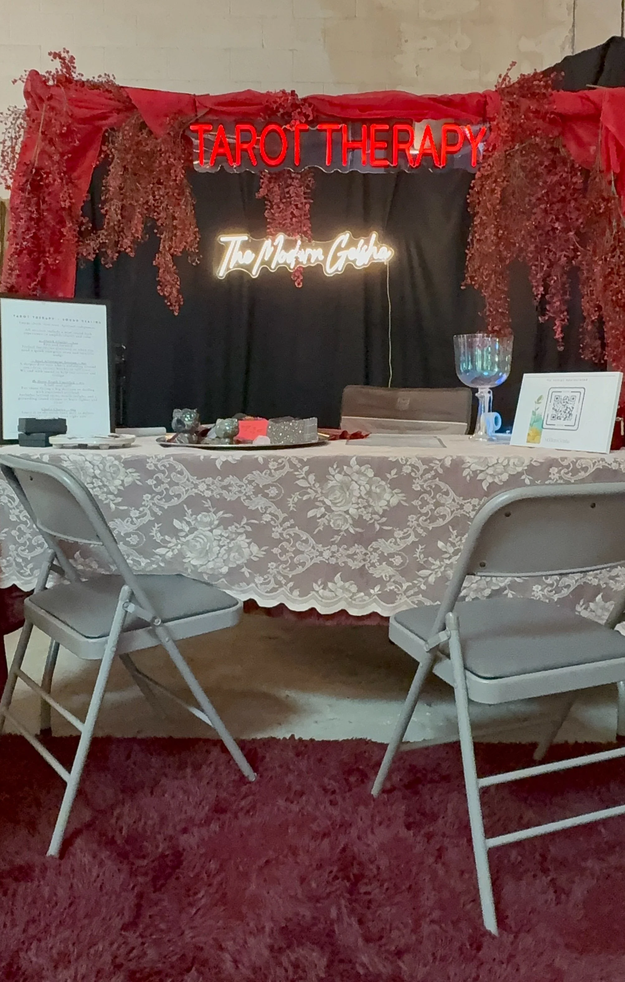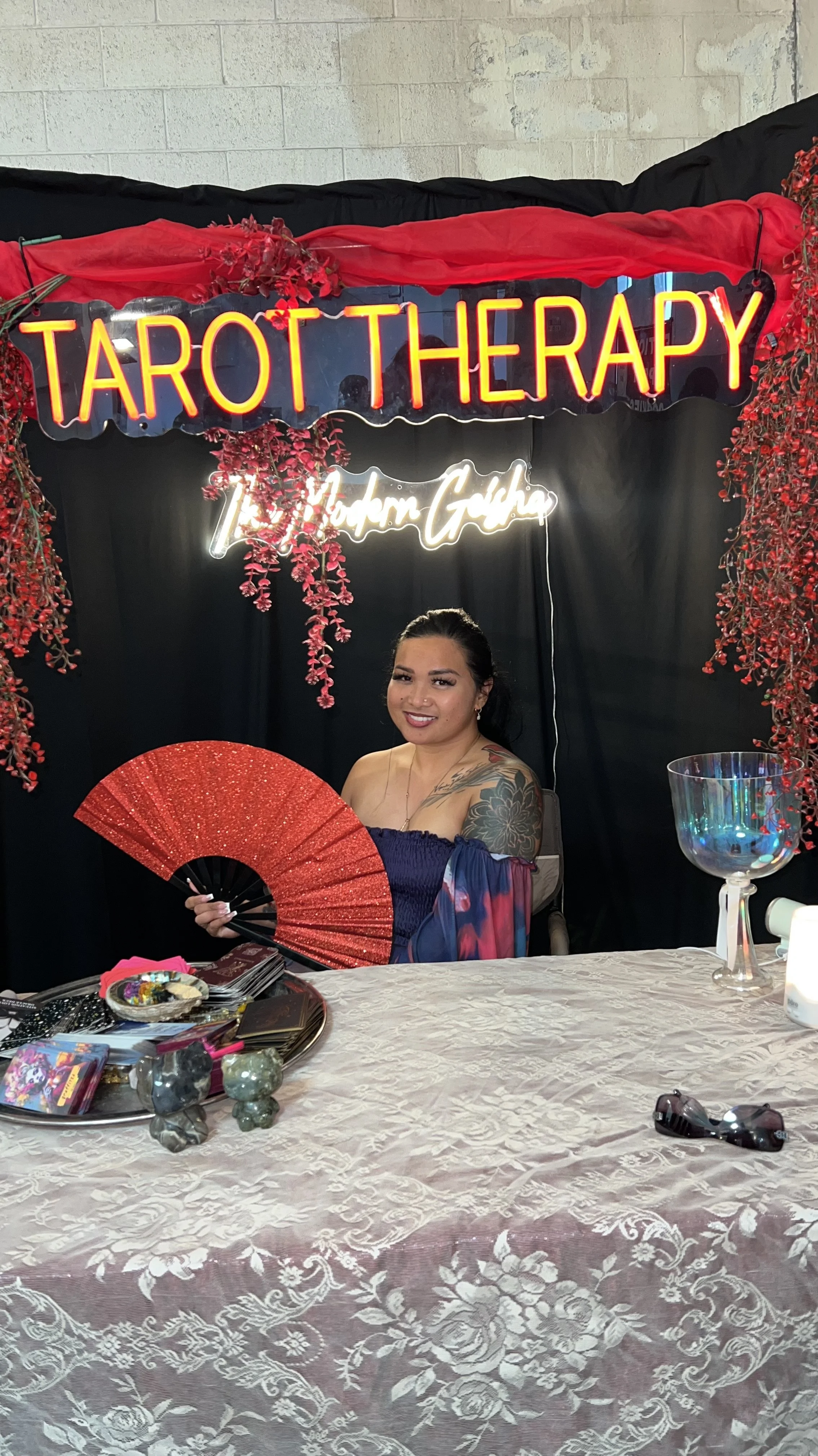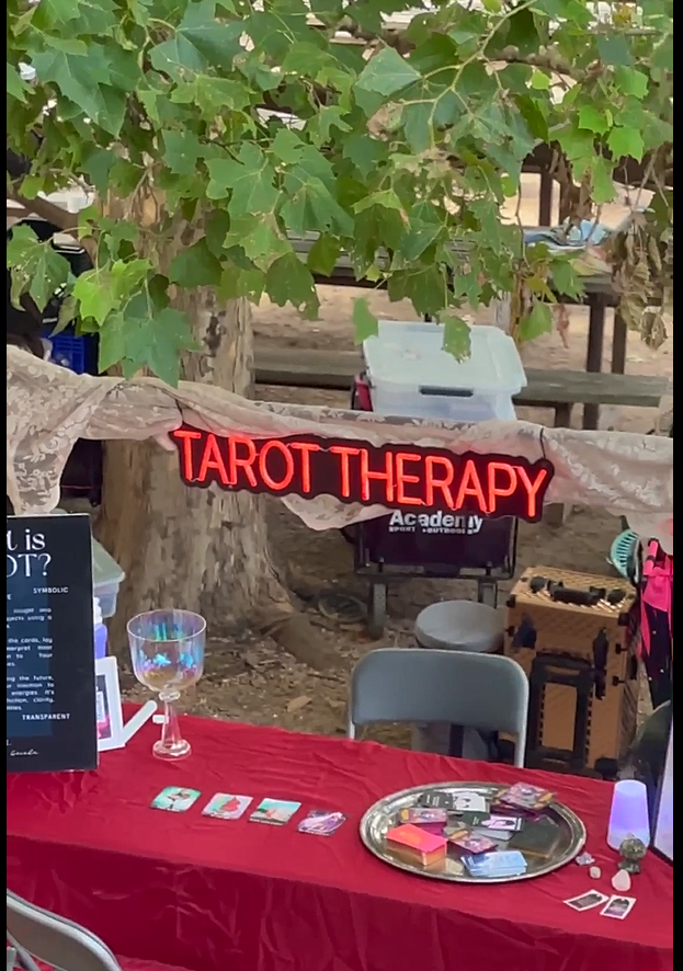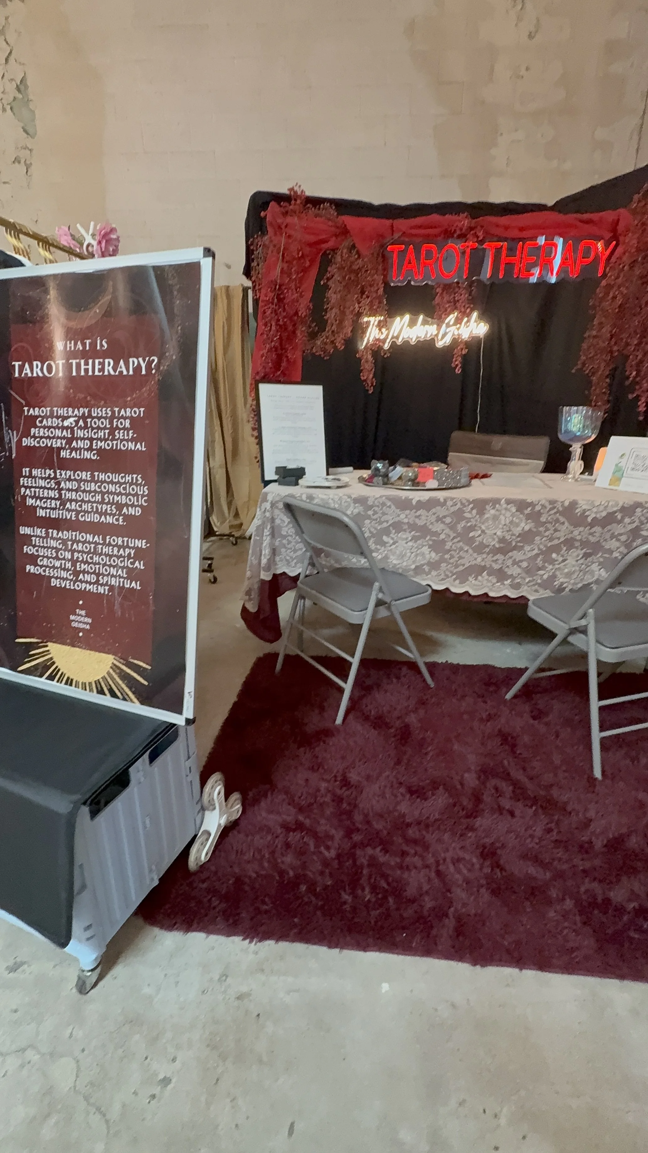 Project 2: Event Marketing & Experience DesignDesigned branded pop-up booths for vendor markets and creating immersive client experiences.Tarot Therapy booth photos (neon sign, setup, signage)Vendor/market activations